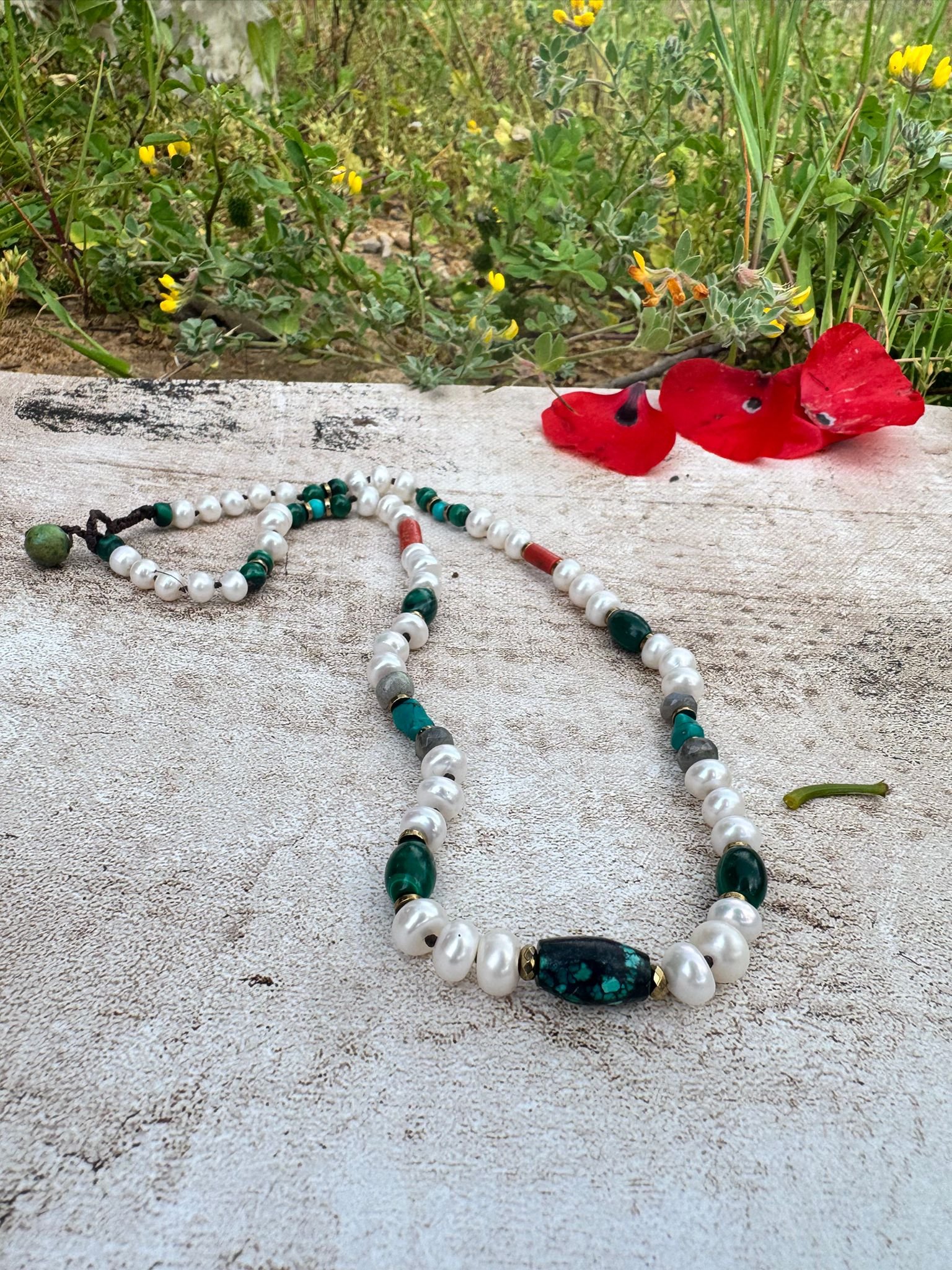 מאלה עוצמתית השואבת את כוחה מהחיבור שבין מצולות הים לעומק האדמה. היא נוצרה כקמע של התחדשות, חיוניות והגנה רב-שכבתית, המשלב בין אבנים המייצגות צמיחה פראית לבין אבנים המעניקות שלווה מלכותית. המאלה מזמינה אותך להתחבר לכוח החיים הזורם בך, תוך שמירה על איזון רגשי ובהירות רוחנית.
